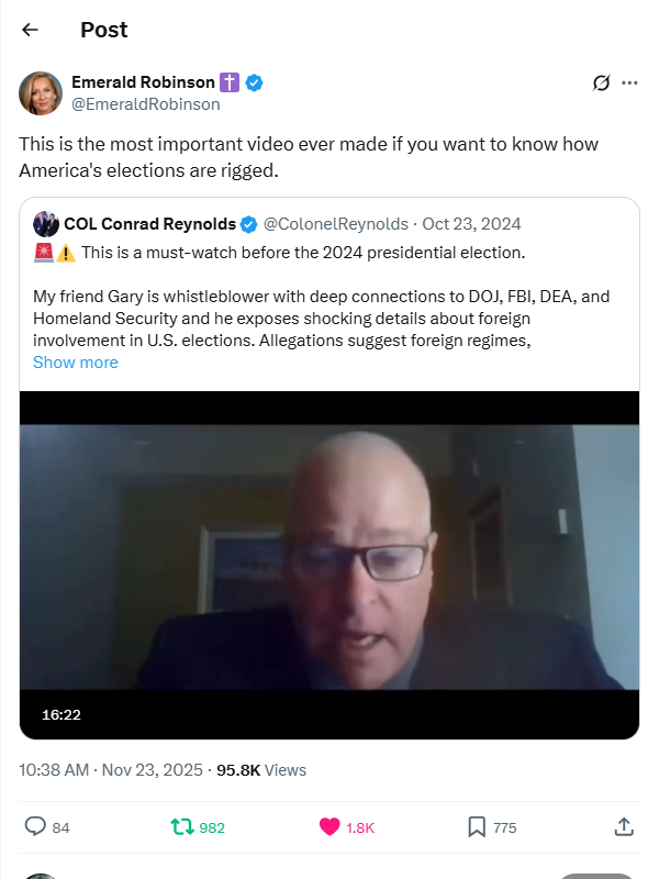 HOW ELECTIONS ARE STOLEN: DEEP STATE WHISTLEBLOWER WITH EMERALD ROBINSON https://x.com/EmeraldRobinson/status/1992633856315593054