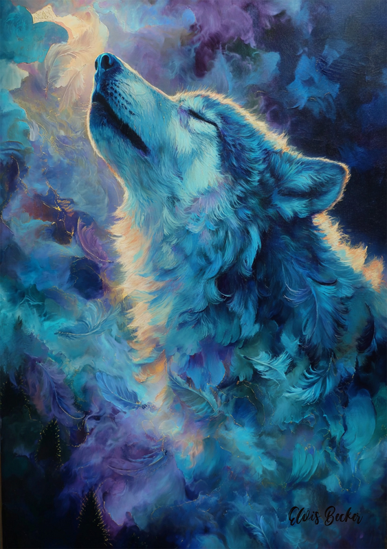 The Blue Howl Between Worlds From the deep breath of night you rise, fur woven of sky-water and sacred smoke, your throat lifting toward the unseen fire where ancestors keep the first songs. You do not howl in loneliness— You call the stars by their old names. names that remember us Before we learned to forget ourselves. Around you, feathers drift like spirits resting. Each one a story released, not lost. The wind listens. The earth answers by holding still. Your eyes are closed. Yet you see farther than sight allows— into the place where grief softens, where broken hearts relearn their rhythm. O Wolf of the Blue Path, walker of mist and memory, You teach us that strength can be gentle, that silence can speak, That pain can become a doorway. When your voice rises, The veil thins. The living remember the dead. The dead bless the living. And for one trembling moment, all worlds breathe together— as one pack, under one listening moon. . 🎨Artist and the storyteller: Elvis Becker