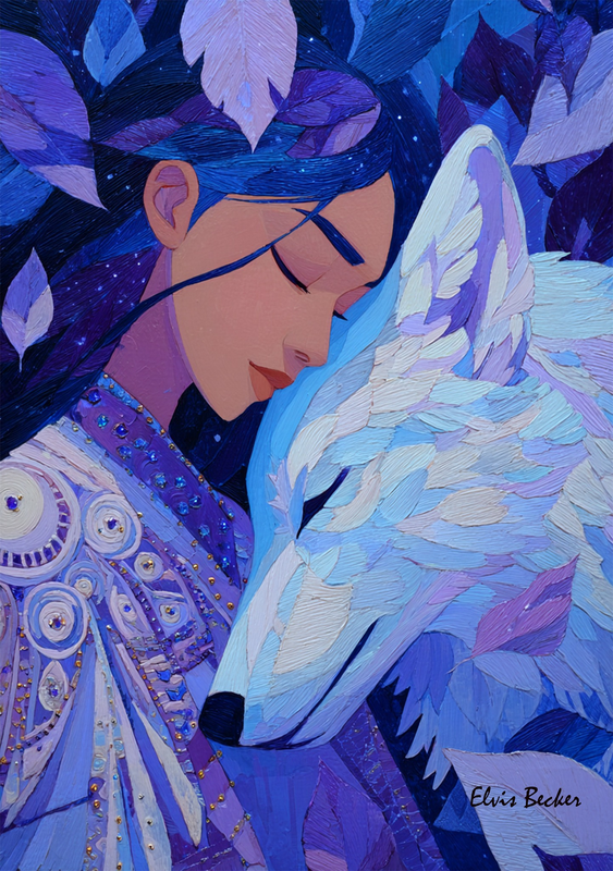 The Wolf Who Guarded Her Night-Soul She rests her brow against the soft crown of a wolf made of moonlight— a guardian born from the hush between stars. Blue leaves tremble in her drifting hair, each one glowing softly as though carrying a forgotten constellation. She closes her eyes. and the night exhales— a slow, ancient breath That wraps them both in a cradle of sky. No vow is spoken, Yet the promise lives: her spirit his shelter, His silence was her shield, two souls woven into one unbreakable dusk.