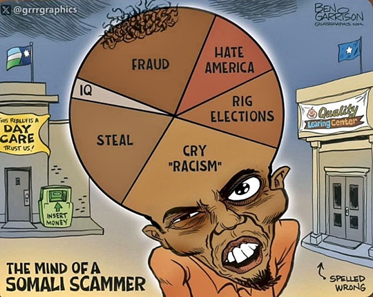 Somalis Scamming American Taxpayers https://oneway2day.wordpress.com/2025/12/31/somalis-scamming-american-taxpayers/ SUMMARY: Thanks to some journalistic grunt work by Nick Shirley, Americans are becoming aware of ongoing Somali scam fraud that has probably been occurring for decades. The fraud is so blatant that it might replace the notoriety of the old Nigerian Scam that has been around for decades. What makes the Somali Scam so insidious is rather than scamming individuals as the Nigerian Scam, the Somalis scam targets State and Federal taxpayer funding. WHICH MEANS of course the Dems are undoubtedly complicit… WAY MORE TO READ INCLUDING NICK SHIRLEY VIDEO & NATALIE WINTERS COMMENTARY! #SomaliScammers #DefraudingTaxpayers